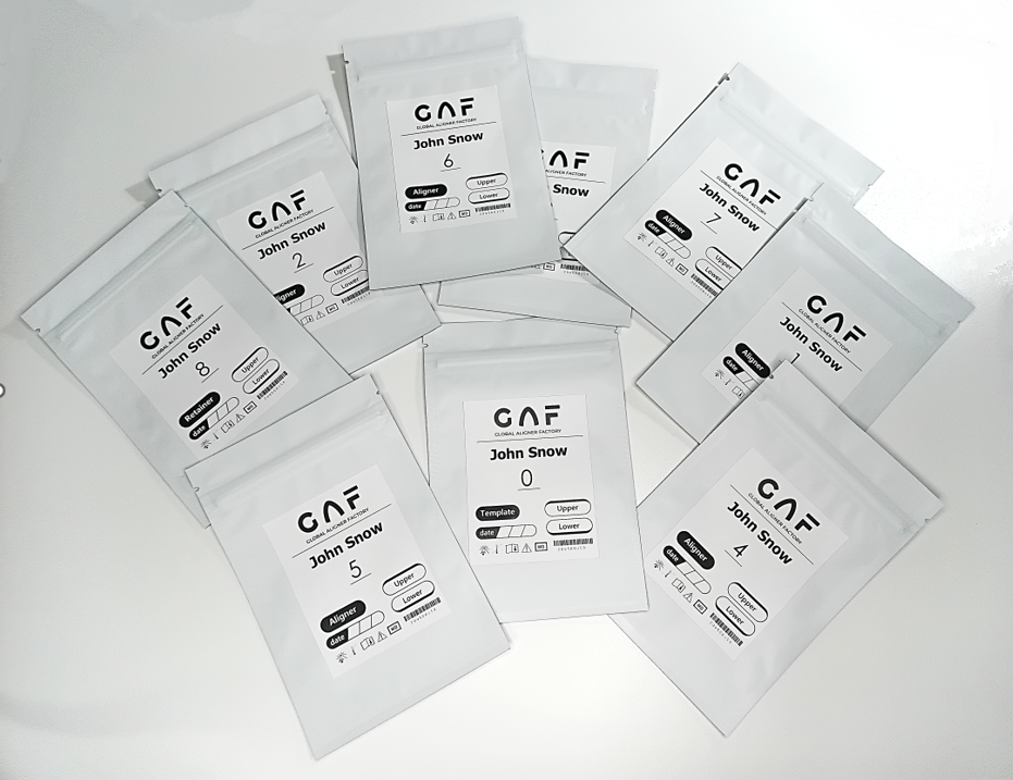 - Aligner-Verpackungsbeutel in Lebensmittelqualität mit individuellem Etikett.